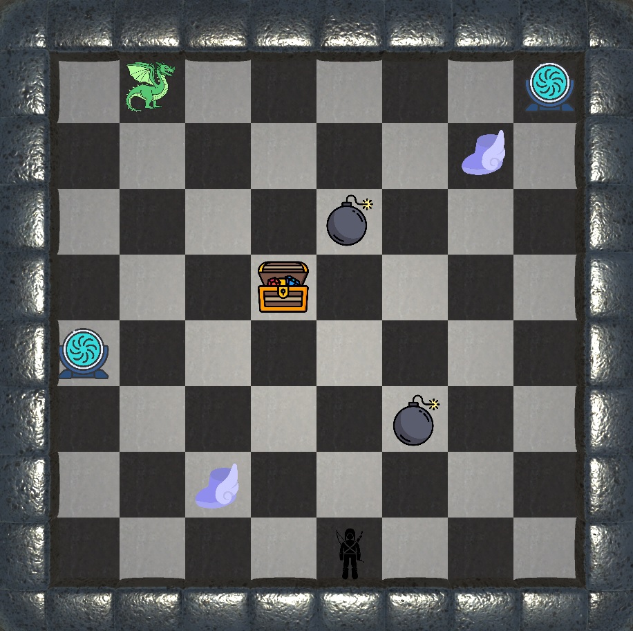 The project is a 2D puzzle. The goal of the game is to get to the treasure without falling into the clutches of the dragon.